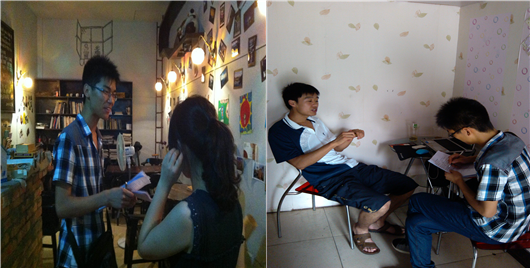 根据原订计划,本次调研将以实地访谈的形式进行,但由于大学生放假,高校周边商业街的许多商铺并不营业,所以给小队暑期调研任务的顺利完成造成了极大的困难。在这种情况下,小队成员经过决议,决定采用实地访谈和电话连线相结合的方式对大学生创业者进行调研。通过第二阶段对商业街的问卷,他们筛选出了若干有价值的是实地访谈对象,其中十余家在营业,并获得了其它6家未营业商店老板的联系方式,最终经过5天的努力,顺利地完成了预订计划。