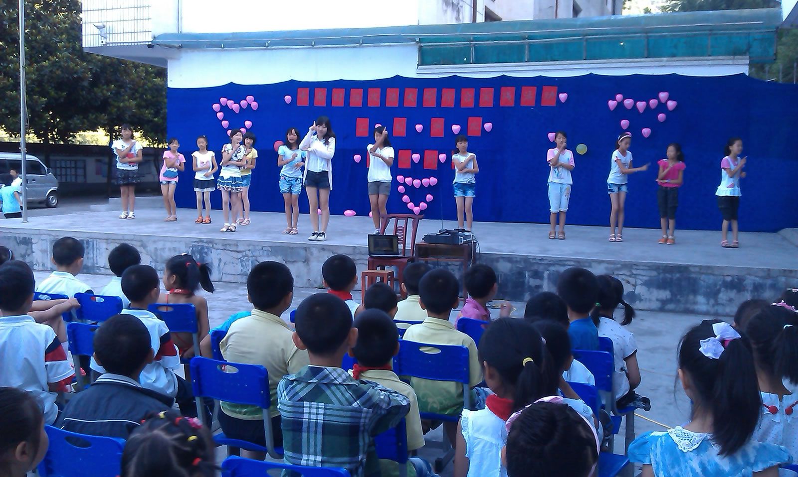 7月23日晚,小队成员在彩排后布置好了文艺汇演场地,并再一次练习了两首合唱歌曲。24日,孩子们在7点前就陆续走进学校,又有很多人拿着纸笔或本子到处寻找老师,期待能够留下支教队员的联系方式;而照相更是不可或缺的一部分,他们最喜欢的就是在镜头前摆出各种POSE、拍摄各种合照。于是,在这样一番温馨的氛围中,文艺汇演在9时许的时候开场了。现场更是引来邵校长、王教务主任和大松树小学的数位老师前来观看,不过他们十分“低调”,只是坐在后面观看节目。此外,还来了部分学生家长,期间用手机拍了不少照片留做纪念。