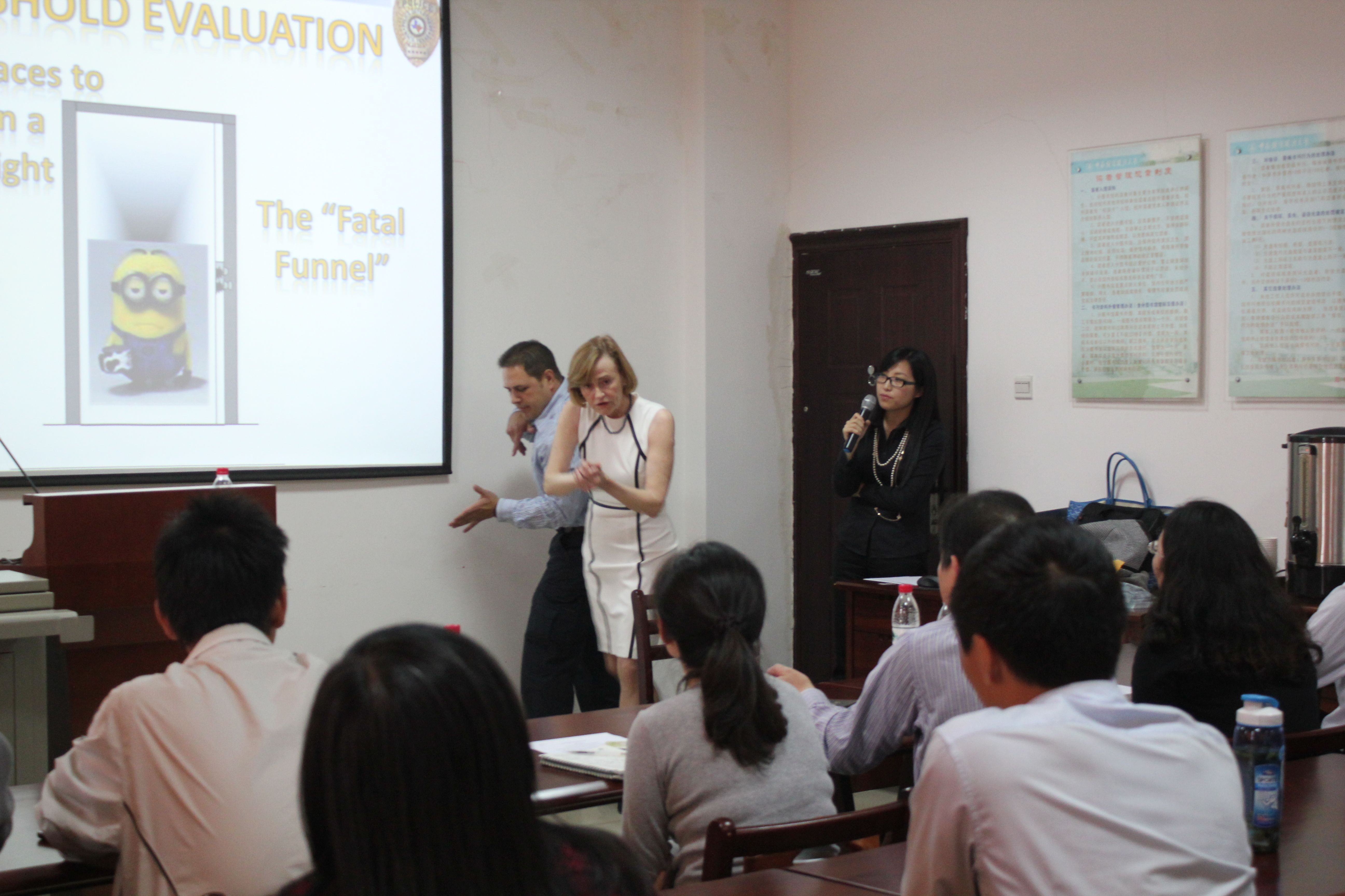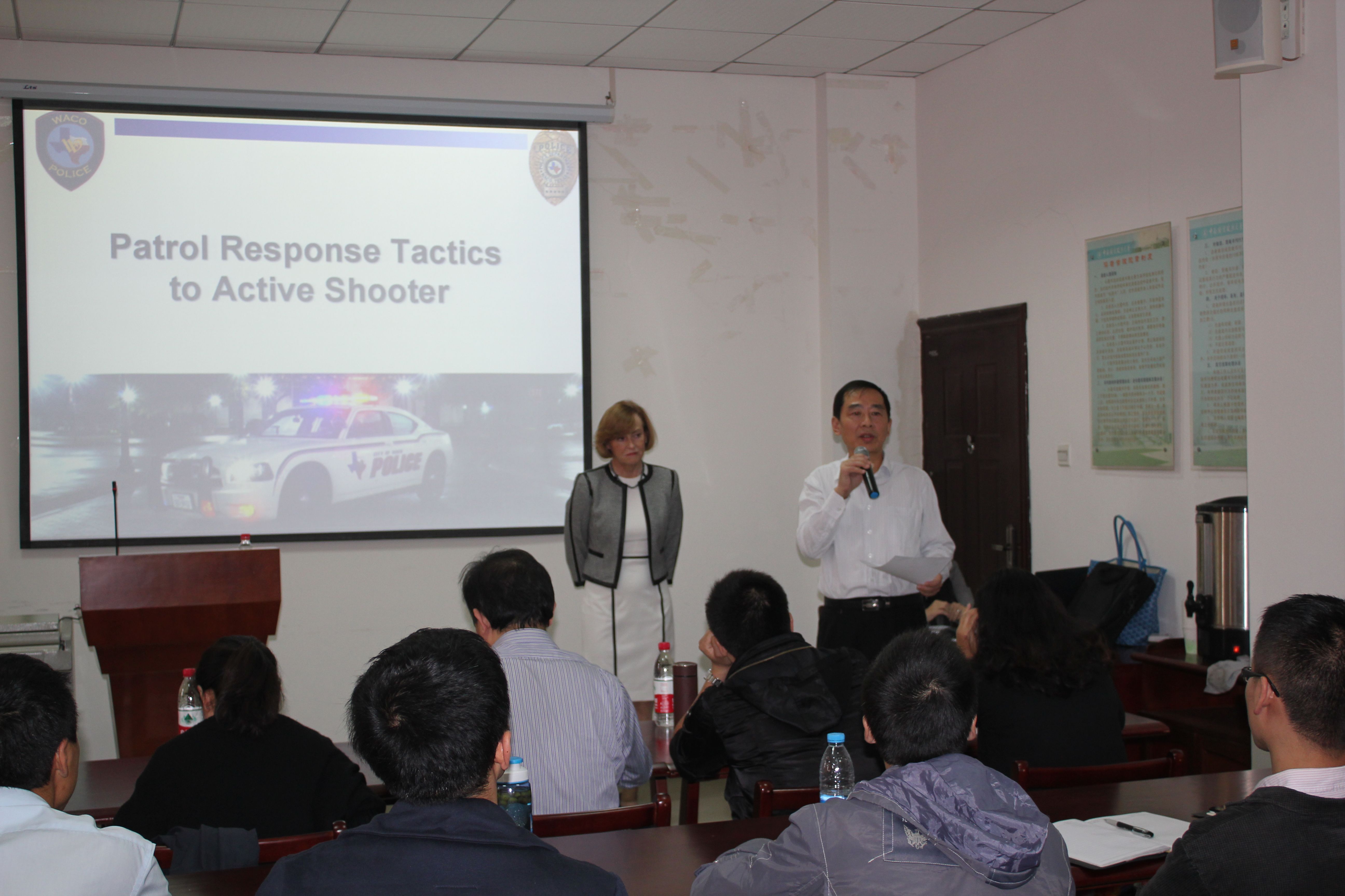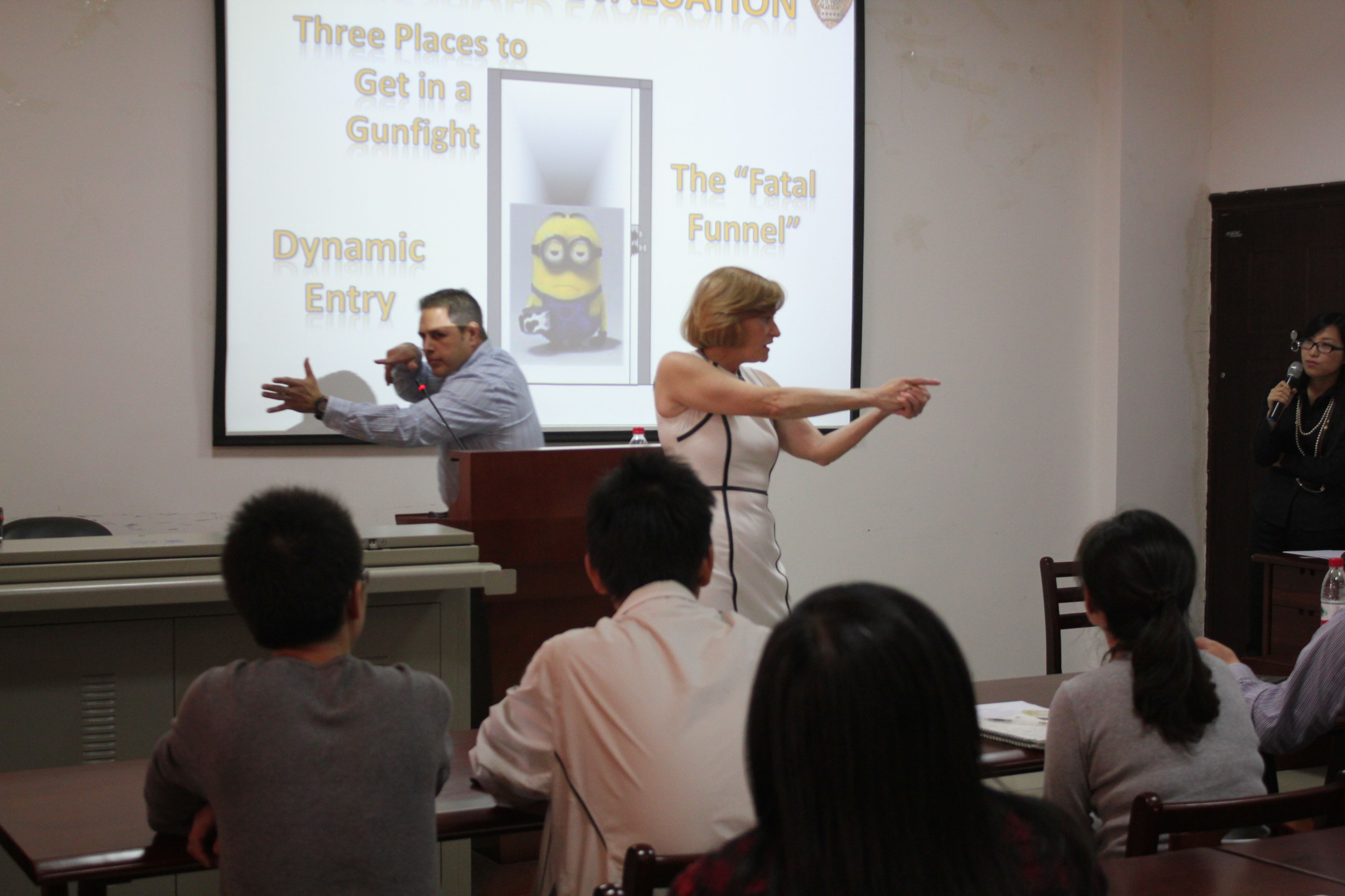 本次讲座由美国德克萨斯州巡警警长Clare女士主讲,就巡警对突发公众枪击事件的应急反应问题进行了交流。据Clare警长介绍,美国突发枪击事件大体上可以分为人质劫持和积极抢手两类。面对人质劫持事件,美国巡警通常采取包围、控制、交流、呼叫特警及制订计划的5c策略;而积极抢手则是采取搜索、找到、面对、制止的主动出击方案。之后, Clare警长还就受害人、同僚以及犯罪嫌疑人的保护优先性问题作出了详细的阐述。