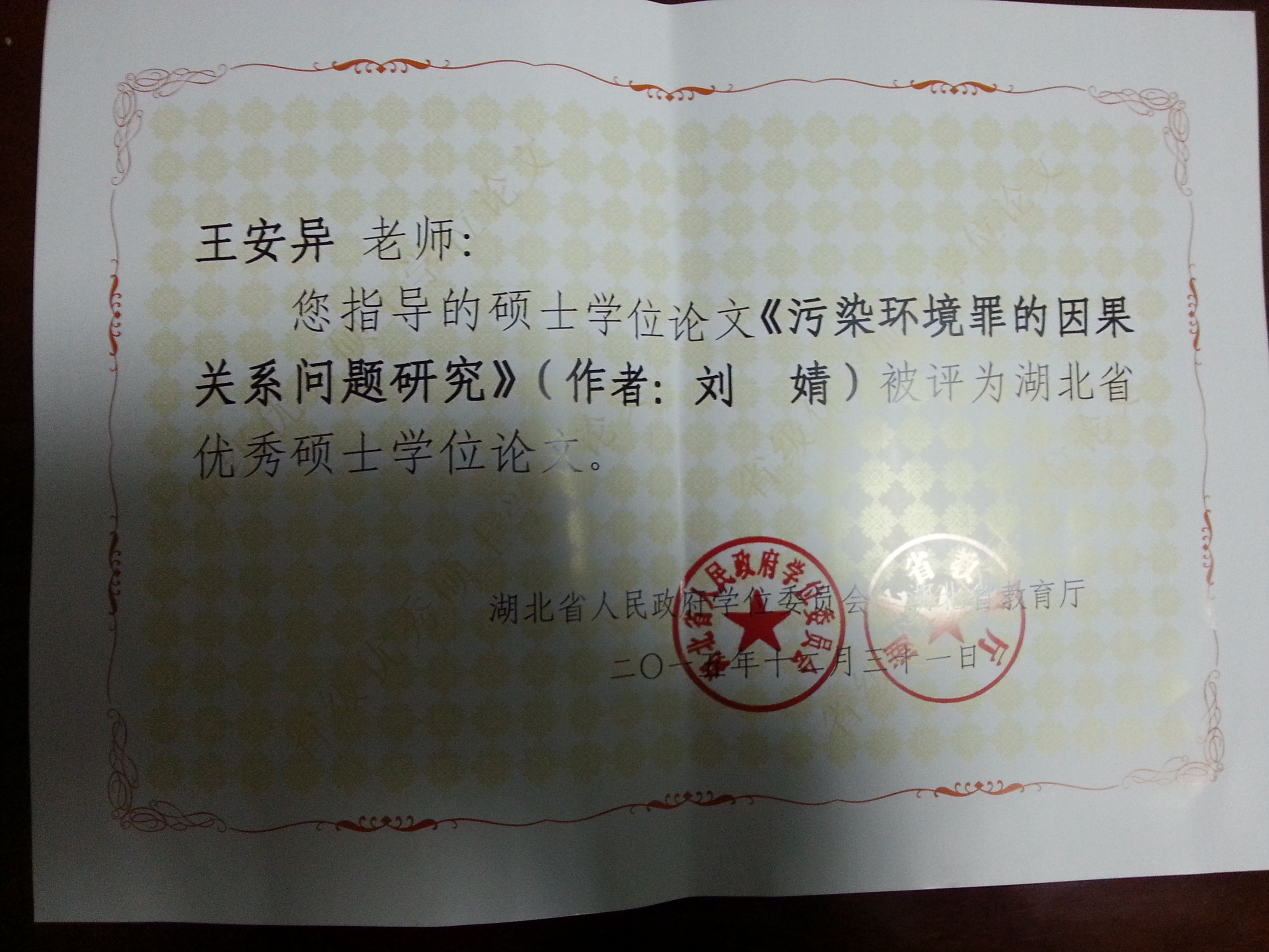 日前,2015年湖北省优秀博士论文和硕士学位论文评选结果揭晓,991网 2011级刑法学硕士研究生刘婧的《污染环境罪的因果关系问题研究 》(指导教师王安异副教授)被评为2015年湖北省优秀硕士学位论文。