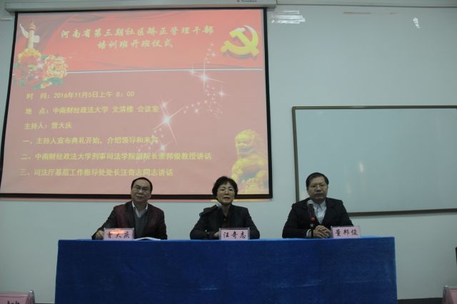 11月5日上午,河南省第三期社区矫正管理干部培训班开班典礼在文清楼四楼会议室举行。出席典礼的嘉宾有河南省司法厅基层工作指导处处长汪奇志同志,991网 副院长董邦俊教授及河南省各级社区矫正司法工作者。培训中心主任曾大庆老师主持了本次开班典礼。