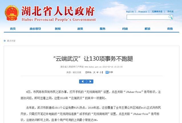 去年底,云端武汉·政务、云端武汉·市民、云端武汉·企业三大服务平台上线。2016年,这些功能将逐一实现。市民出门在外,蹭着iWuhan-Free免费上网,可通过“云端武汉”三个平台办事,一部手机,居家生活、创新创业、政务办事,“小事不出社区,大事不出街道”。