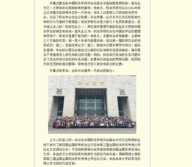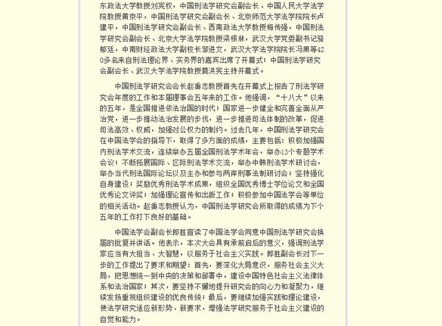 刑事法研究中心主任莫洪宪教授、北京师范大学刑科院院长赵秉志教授分别在闭幕式上致辞。最后,在热烈的掌声中,中国刑法学研究会第二届会员代表大会暨2016年全国刑法学术年会胜利闭幕。(撰稿人:熊琦,尚勇,张婷)