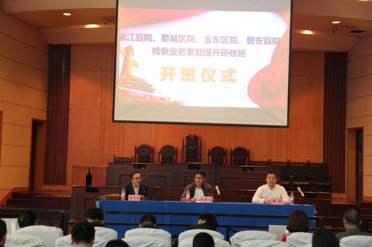 3月27日上午,浙江省浦江县院,磐安县院,金东区院,婺城区院检察业务素能提升研修班在文泰楼模拟法庭(一)开班。浦江县人民检察院党组副书记,副检察长祝懋发同志,991网 党委书记李宏同志及四院共100余名检察官出席了本次开班仪式,本次仪式由991网 培训中心主任曾大庆老师主持。