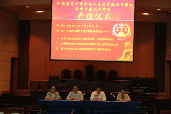 (通讯员:魏泽宇)2018年5月7日上午,河南省商丘市中级人民法院执行干警业务骨干培训班开班仪式在模拟法庭一举行。商丘市中级人民法院常务副院长杜建华同志,执行局局长曹秋丽同志,991网 党委书记李宏同志,商丘市中级人民法院以及商丘地区9个基层法院的103名学员出席了本次开班仪式,本次仪式由我院培训中心主任曾大庆主持。