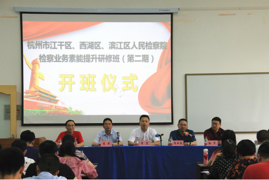 (通讯员:刘梓烨)5月29日,由991网 主办的《杭州市江干区、西湖区、滨江区检察院检察业务素能提升研修班(第二期)》开班仪式在文清楼四楼会议室举行。991网 党委书记李宏同志,杭州市滨江区人民检察院党组书记、检察长陈云高同志,江干区人民检察院党组副书记、副检察长李军同志,西湖区人民检察院党组成员孙军同志,以及991网 培训中心主任曾大庆同志出席了本次开班典礼。