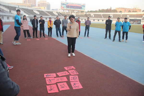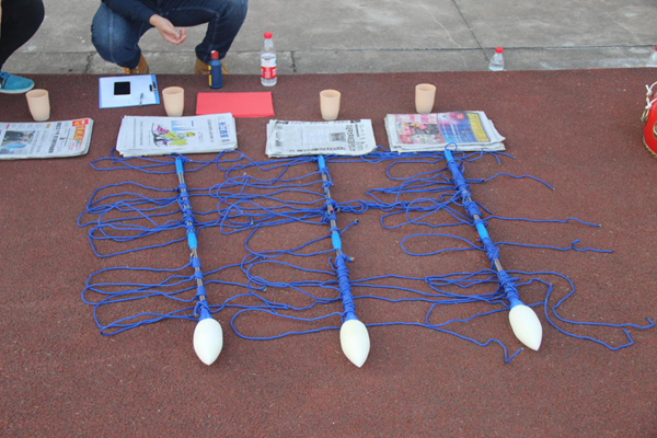 激动人心的“鼓动人心”环节之后,南瓜教练神秘地告诉大家:“大家看一下后面是什么?”大家看到了几个很大的“毛笔”,教练告诉大家,这是接下来环节的重要道具,接下来的环节名字叫“神笔马良”。具体的活动是每个人用手抓住笔上绑着的绳子,在大家的共同努力下用这只大号的“毛笔”写出一首集合每个人姓名中所含字的“诗句”。