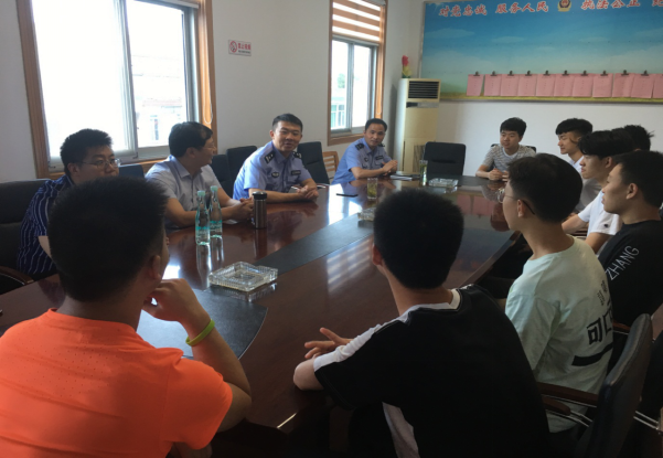 领导老师们在句容市公安局政治处吴玉琢主任和何磊副主任的陪同下到达华阳派出所,在派出所会议室,来自市局刑警大队、经侦大队,开发区派出所,华阳派出所共11名实习生已集结完毕,等候老师们的到来。下午三点半会议正式开始,吴玉琢主任首先对董院长一行表示热烈欢迎,对同学们实习开始以来所做的工作表示了肯定,鼓励大家再接再厉顺利完成实习任务。接着,董院长对句容市公安局和991网