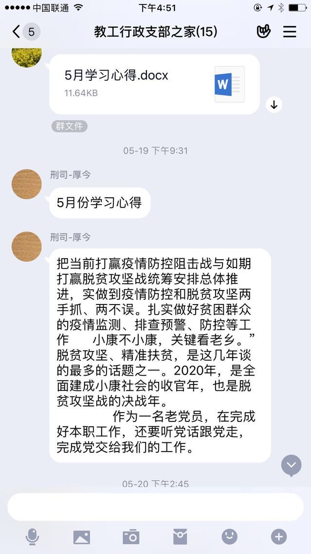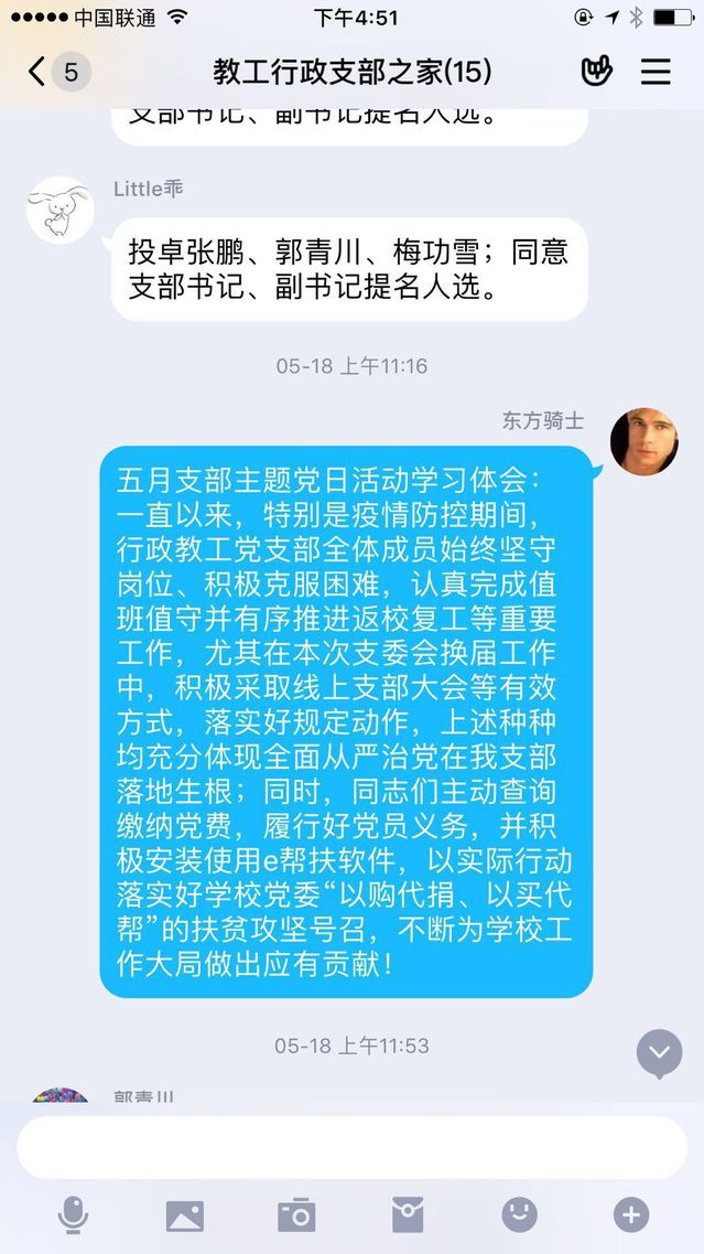 在本次主题党日活动中,大家提前自学了相关文件,深刻领会会议精神,积极分享心得体会。刘宇同志谈到疫情防控期间,行政教工党支部全体成员始终坚守岗位、积极克服困难,认真完成值班值守并有序推进返校复工等重要工作,在本次支委会换届工作中,采取线上支部大会等有效形式,落实各项规定动作。同时,同志们主动查询交纳党费,并积极安装使用e帮扶软件,以实际行动落实好学校党委“以购代捐、以买代帮”的脱贫攻坚号召,不断为学校工作大局做出应有贡献。厚今同志认为要充分发挥党员同志的先锋模范作用,听党话跟党走,做到疫情防控和脱贫攻坚两手抓、两不误,积极主动完成各项工作,“不忘初心、牢记使命”!郭青川同志谈到作为一名辅导员,虽然我们的服务对象——大学生群体仍未返校,但切不可轻易认为还处在假期或“无工作”状态,要充分利用线上平台,确保和每一位同学都有密切联系,第一步要摸清楚学生的所在地和身体健康状况,第二步要主动关心学生是否受疫情影响,若有心理健康问题则可以有针对性地及时进行疏导,第三步要按照学生在校时的工作流程,完成党员发展、团日活动指导及毕业生就业指导等各项工作。