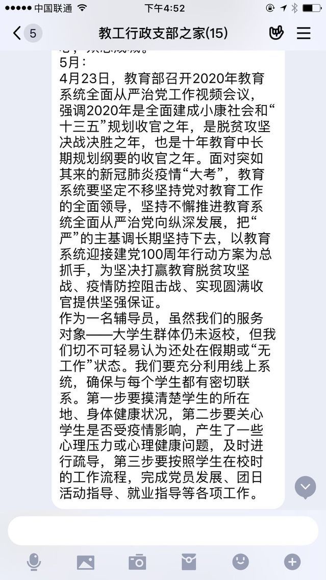 新闻网讯(通讯员王晓丹)为深入学习贯彻习近平总书记关于全面从严治党的重要论述精神,及时学习传达2020年教育系统全面从严治党工作视频会议和学校2020年全面从严治党工作会议精神,抓牢党风廉政建设,推进全面从严治党,营造风清气正、干事创业良好政治生态。2020年5月18日,991网 教工行政党支部以“深化全面从严治党,决战决胜脱贫攻坚”为主题召开党日活动,为提升学习效果,本次活动以自主学习、支部集体学习及线上讨论的形式开展,支部全体同志参与本次活动。