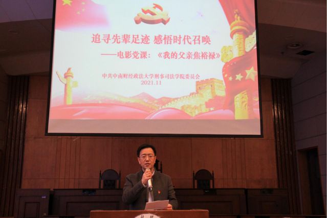 党委书记张志刚同志结合活动主题娓娓道来。他表示电影《我的父亲焦裕禄》的展映为我们带来了党史学习教育的“生动素材”。焦裕禄精神同红旗渠精神、愚公移山精神一样,是实现中华民族伟大复兴中国梦的强大力量。焦裕禄同志的公仆情怀、求实作风和奋斗精神值得全体刑司人学习。希望各位老师学习弘扬焦裕禄精神,立德树人,不仅要做学生们锤炼品格的引路人,还要做学生们学习知识、创新精神和奉献祖国的引路人,为培养国家建设栋梁之才贡献力量;同时希望各位同学要传承好中南大的红色基因,弘扬好焦裕禄精神,践行好“请党放心,强国有我”的铮铮誓言。