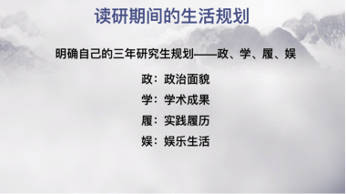随后,为了更好地帮助同学们作出生活规划,李家琪同学细致全面地于政、学、履、娱这四个方面进行介绍:于政,应严格遵守党纪党规,根据自身政治面貌来规划入党申请;于学,应妥善安排修习学分,同时积极规划论文的撰写与发表;于履,应充实校内、校外实践经历,完善自身履历;于娱,应丰富自己的课余生活,做到劳逸结合。
