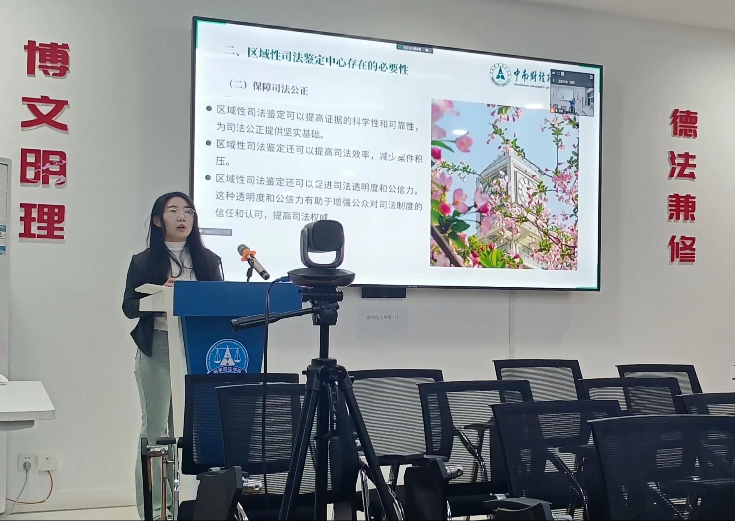 第一位发言人是22级侦查学硕士生葛庆瑜,她以《区域性司法鉴定中心存在的必要性和可行性分析》为题,从区域性司法鉴定中心的定义、区域性司法鉴定中心存在必要性和可行性、模式探索等方面进行阐述。