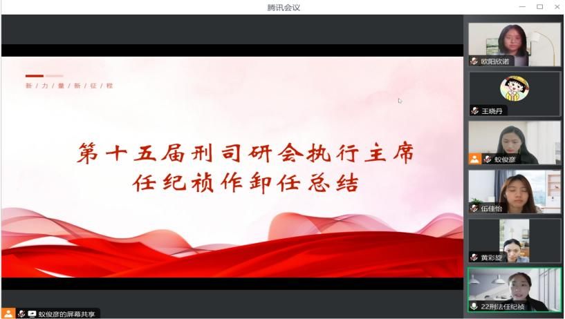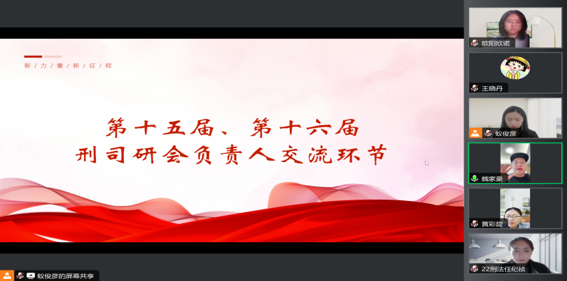 最后,进入到第十五届、第十六届刑司研会负责人交流环节。第十五届研会负责人分享了他们在工作规划、形式创新、沟通协作和人员管理等方面的经验,为新一届负责人提供了宝贵的指导和启发,第十六届研会负责人则表达了对老师与师兄师姐的感激之情,同时也表明了为研会奉献的坚定决心。