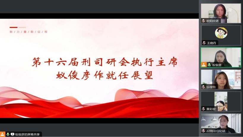 接着,第十六届刑司研会执行主席蚁俊彦作表态发言。她首先对老师与上一届负责人的认可表示了感谢,并承诺今后将严格要求自己,在强化团队建设、创新工作方式和加强交流合作三个方面追求卓越,致力于将研会建设推向新高度。