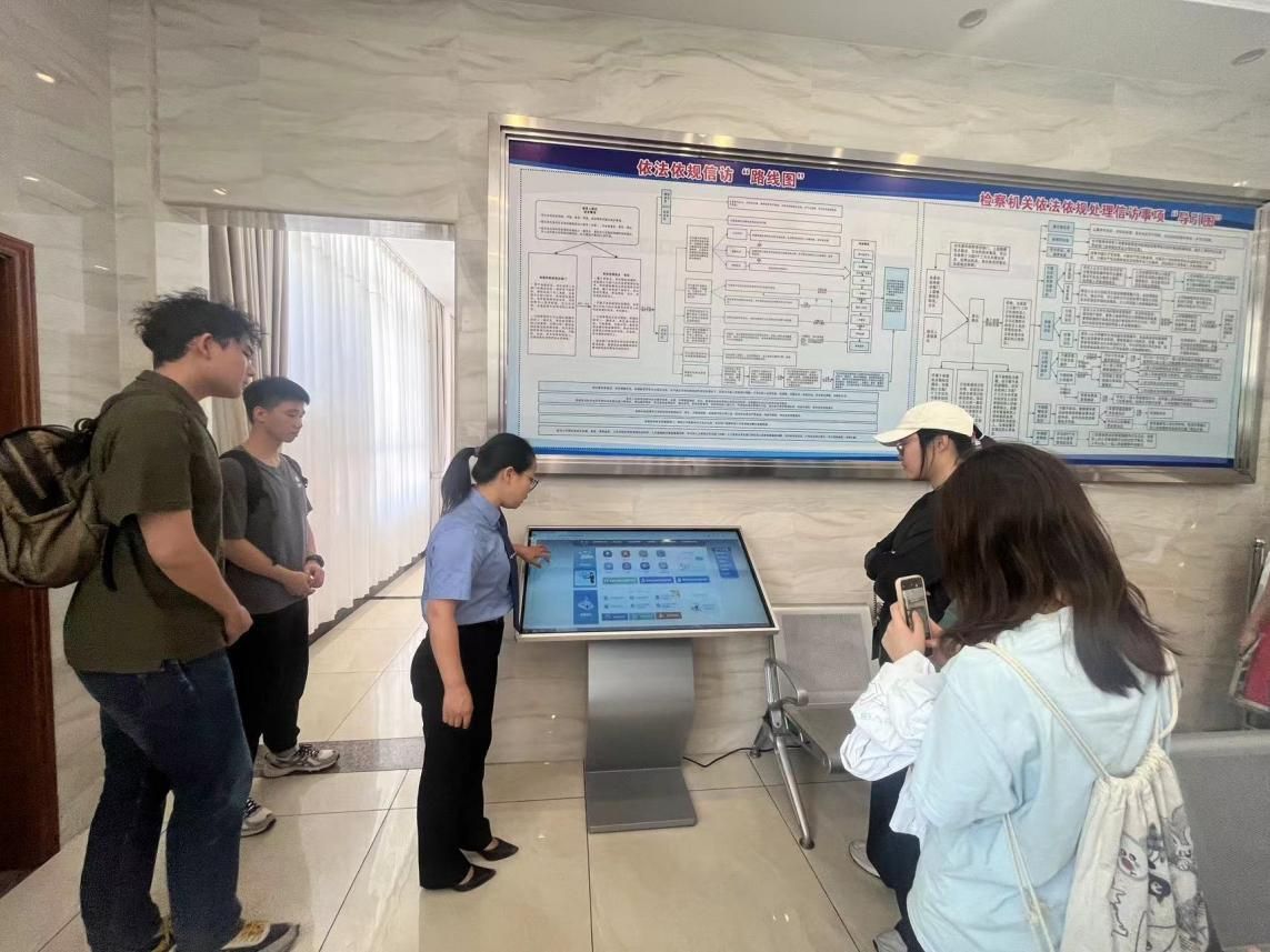 其次,小分队来到了化州市人民检察院参观学习其工作内容和各类活动。在检察官的带领下实地参观了12309检察服务大厅、刑检业务接访室、民行业务接访室、检察长接访室、律师之家等场所。检察官结合现实案例详细讲解了刑事检察、民事检察、行政检察、公益诉讼检察这四大检察职能。通过身临其境的体验,实习小队切身感受到了浓厚的检察文化氛围,进一步加深了对检察工作性质的认知。检察官还以互动问答方式与学生进行了深入的职业感悟交流,结合多年一线办案经历,与小队成员分享了真实工作故事与检察从业感悟,小队成员得以零距离体验到新时代检察官铁肩担正义的高尚风采与温情润民心的深厚情怀。