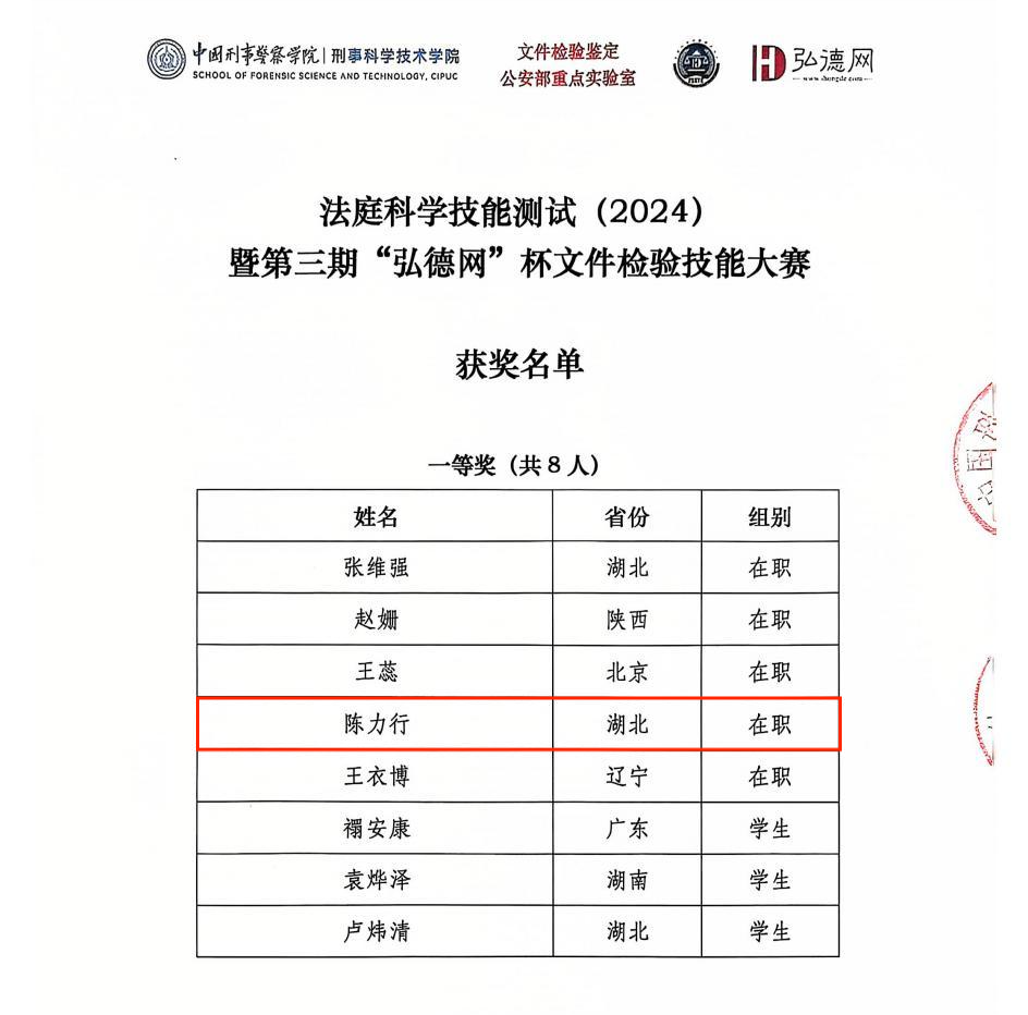 司法鉴定中心陈力行同志凭借扎实的专业功底,圆满完成了印章印文检验、朱墨时序检验和变造打印文件检验三个测试项目的全部比赛任务,所有测试项目均获得通过。从众多专业选手中脱颖而出,取得了大赛一等奖的优异成绩。