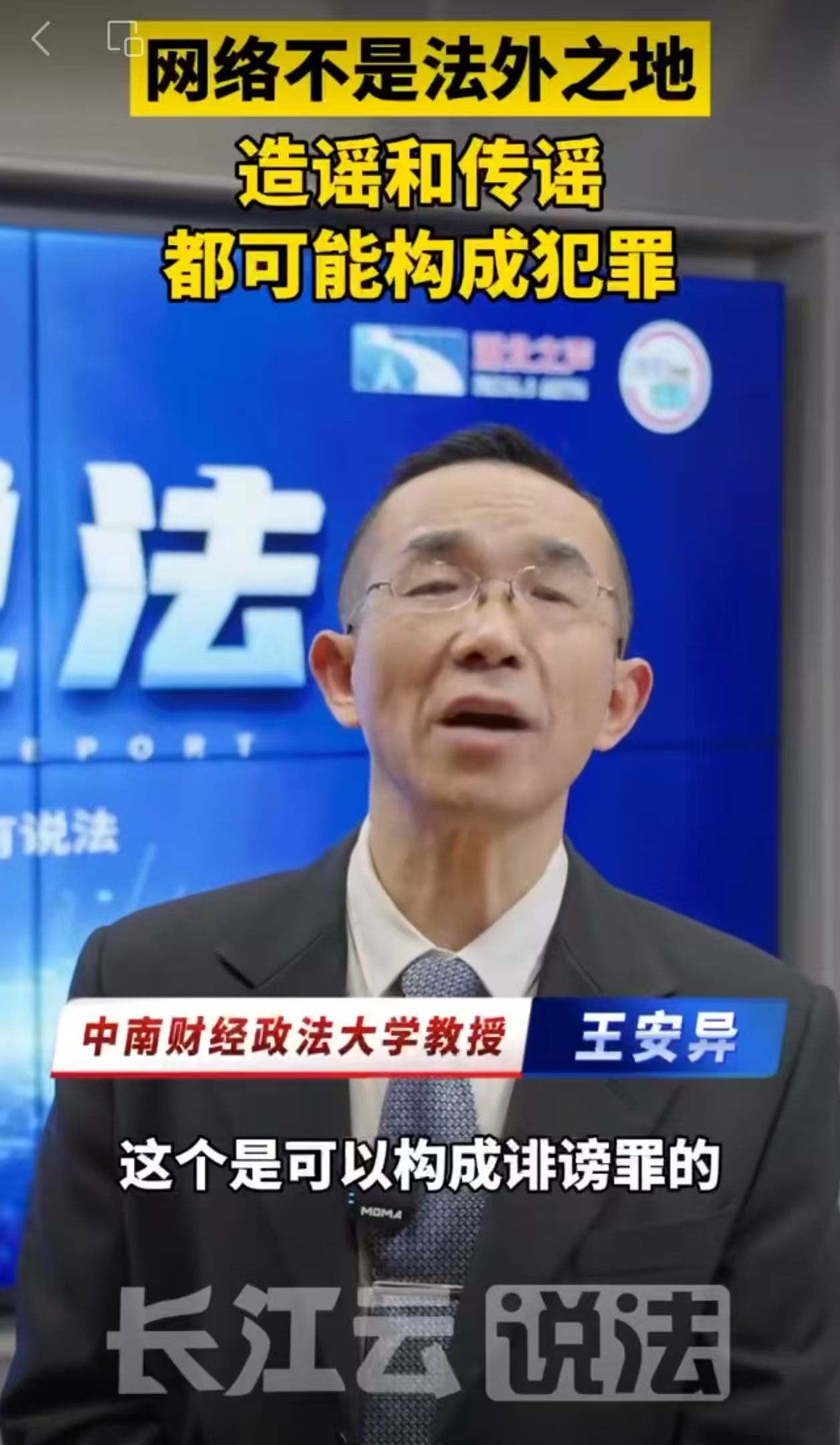 紧接着,在12月4日,王安异教授接受了湖北广播电视台的采访,进行了普法宣传。他强调了“网络不是法外之地,造谣和传谣都可能构成犯罪”的观点,提醒公众在网络空间中也要遵守法律规定,维护网络秩序。