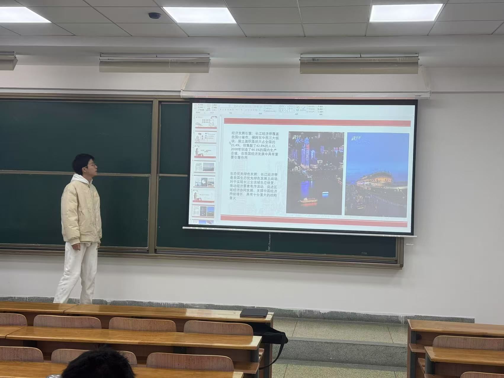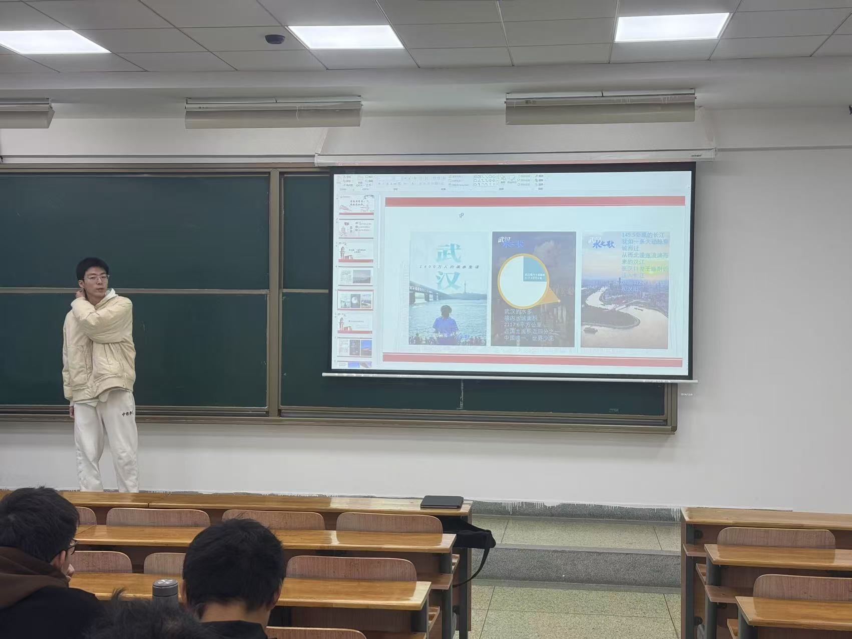 活动第一项,公安2401班团支书胡炜韬以武汉为例子,为同学们讲述了武汉与长江的故事。同学们认真聆听团支书的分享,通过欣赏长江照片与了解官方数据,不仅加深了对武汉这座城市的了解,更增强了同学们对长江这条母亲河的认同感。