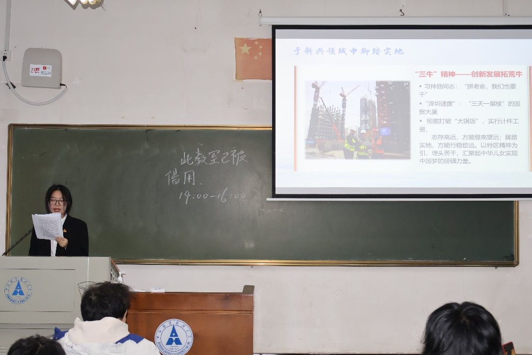 活动第一项,由宣讲团队员田嘉欣同学介绍“特区精神”的由来与内涵,详细介绍了特区人民建设特区的艰难,展现了他们身上敢闯敢试、敢为人先、埋头苦干的特区精神。