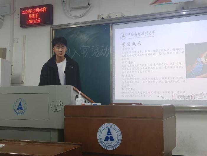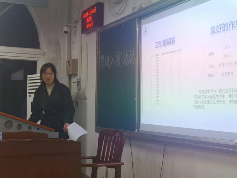 “博观而约取,厚积而薄发。”中区3栋111寝室代表从成员简介、学习情况、生活情况、寝风建设四个方面向在场同学展示本寝室的学风建设成果。该寝成员成绩优异,积极参加各类科研竞赛,学风建设基础良好。宿舍每周会定期小扫除,保持整洁有序,营造良好的学习生活环境。在遇到矛盾时也能有效沟通,及时解决,寝室关系和谐友好。