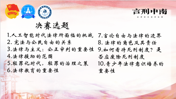 本次决赛,十名经过初赛的优秀选手围绕“人工智能时代法律所面临的挑战”、“宪法与公民自由的关系”、“法律与正义:公正审判的重要性”、“法律援助的范围”、“轻罪化时代-轻罪的治理之策”、“法律教育的重要性”、“言论自由与法律的边界”、“法律的角色及其责任”、“如何看待死刑制度?是否应该废除死刑制度”、“青少年法律意识培养的重要性”这十个论题展开,深入浅出地阐述了他们对于各自所抽取到论题的精妙见解,分享了他们对于法治建设的所思所想。