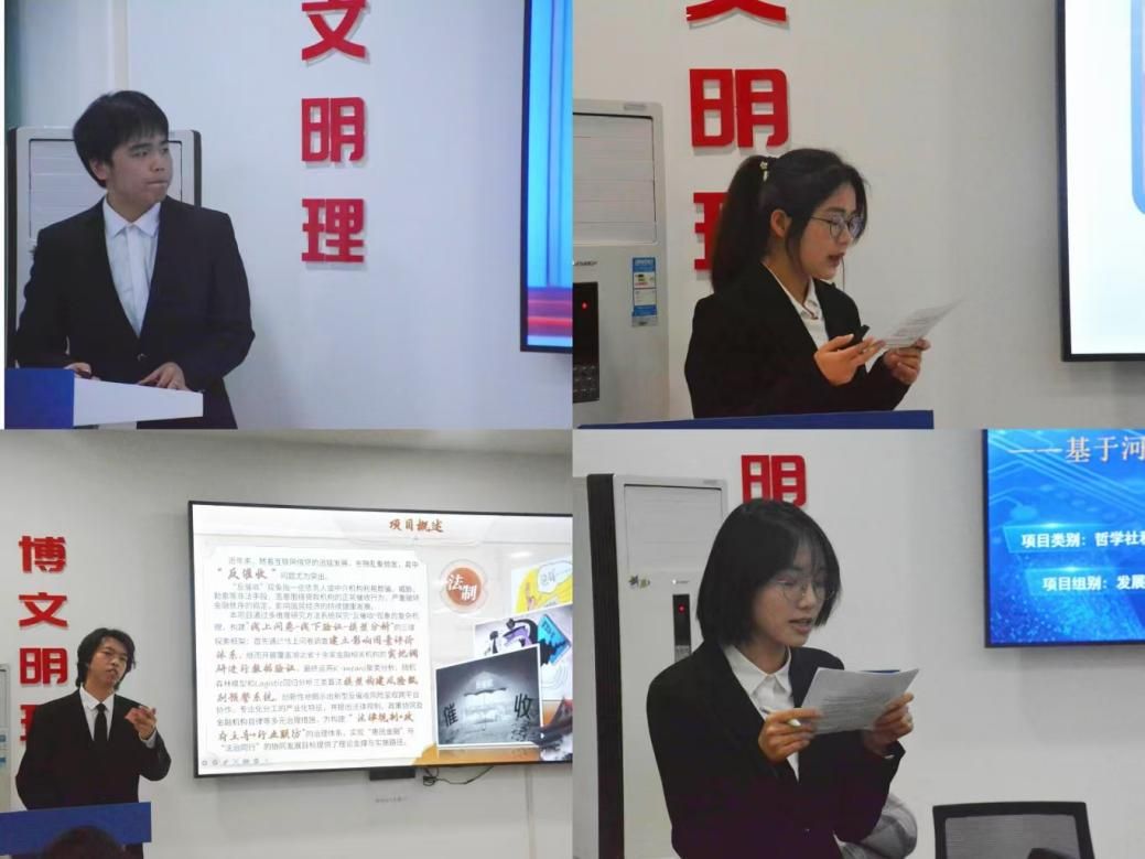 在创新类赛道的展示环节中,各团队依次呈现了多个前沿研究项目。首先是以端到端技术为核心的自动驾驶风险规避与社会治安问题研究;随后是网络犯罪侦查中公私合作机制的构建探索;接着是校园欺凌防治领域的AI预警与心理教育协同赋能体系;此外,还有针对金融法治与“反催收”黑灰组织的甄别预警及治理机制研究、基于大数据证据的刑事庭审困境与破解研究、黄精产业产学研融合的实地调研与分析,以及数智赋能下跨境虚拟货币洗钱犯罪证据固定的技术实现。区块链与云端智库的结合、缓刑撤销制度中漏罪发现标准的类型化分析、刑事涉案虚拟货币处置的困境与出路,以及基于博弈论的网络刷单返利诈骗预警劝阻机制创新等研究也相继亮相。