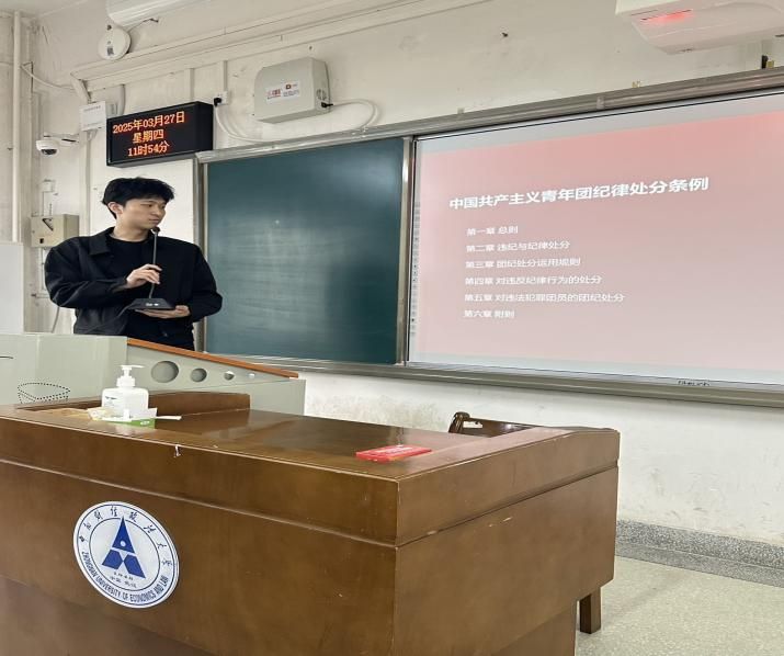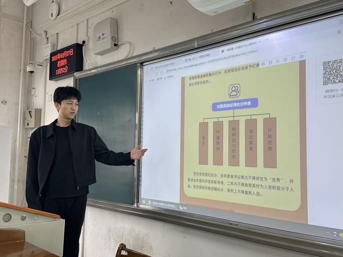 随后,方睿轩同学向大家详细讲解了团的纪律相关知识,包括违纪与纪律处分、团的纪律处分种类、团纪处分对团员的影响等内容,使同学们对团纪有了更全面、更深刻的认识。