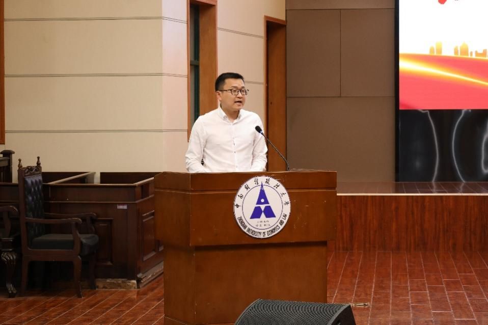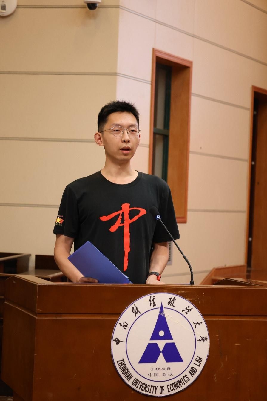 华中科技大学国旗仪仗队队长张浩哲作为兄弟院校代表发言。他分享了队员们不畏艰难、刻苦训练的故事,共护一面旗,同担一份责。