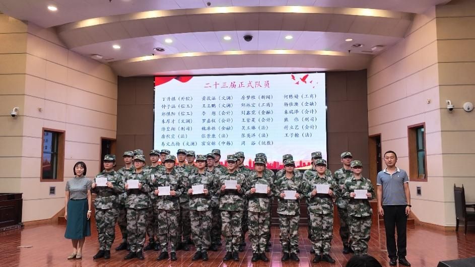在庄严的国歌声中,入队仪式正式拉开帷幕。党委学工部、人武部副部长白雷致辞。他指出,国旗护卫队是一支镌刻着信仰与荣耀的队伍,护卫国旗的荣光,需要汗水浇灌,更需要理想信念支撑,每一位队员都应以此为荣,以此为责,用实际行动践行对国旗的庄严承诺。党委学工部、人武部黄艳和胡万松老师为23届新队员颁发队员证。