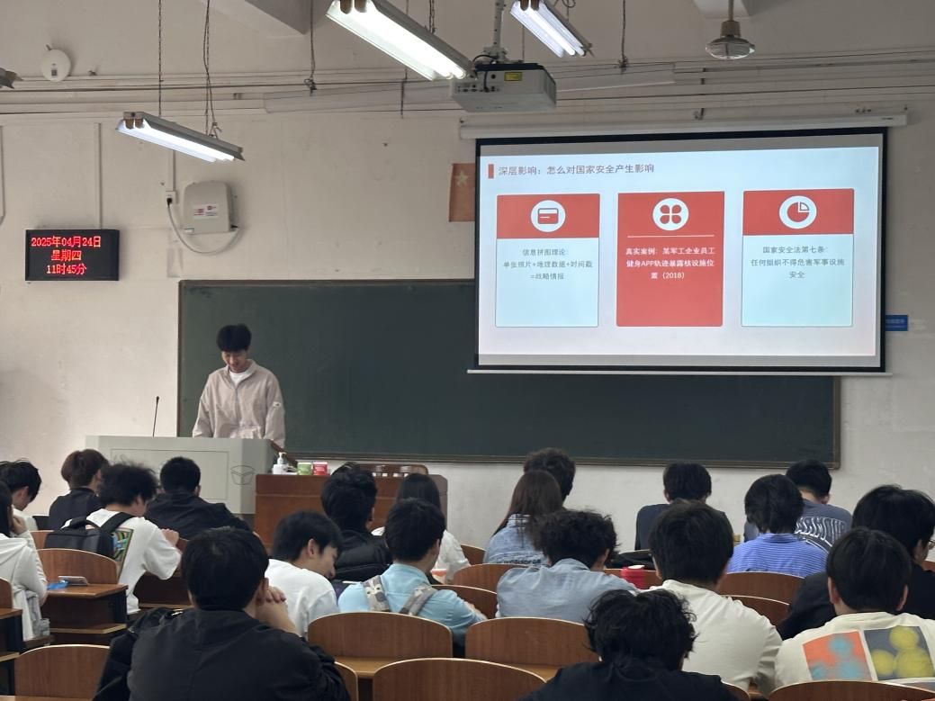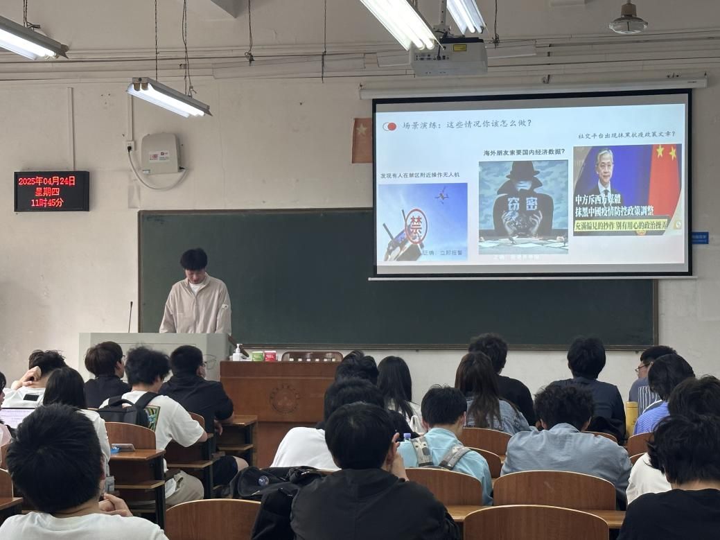 此外,团支书深入围绕网络安全、生物安全、数据安全等六大领域进行讲解,通过情景化的讲解普及防护知识。在探讨深层影响与正确做法时,“四不原则”在同学们心中牢固树立起来,明确了在生活中应当如何维护国家安全。