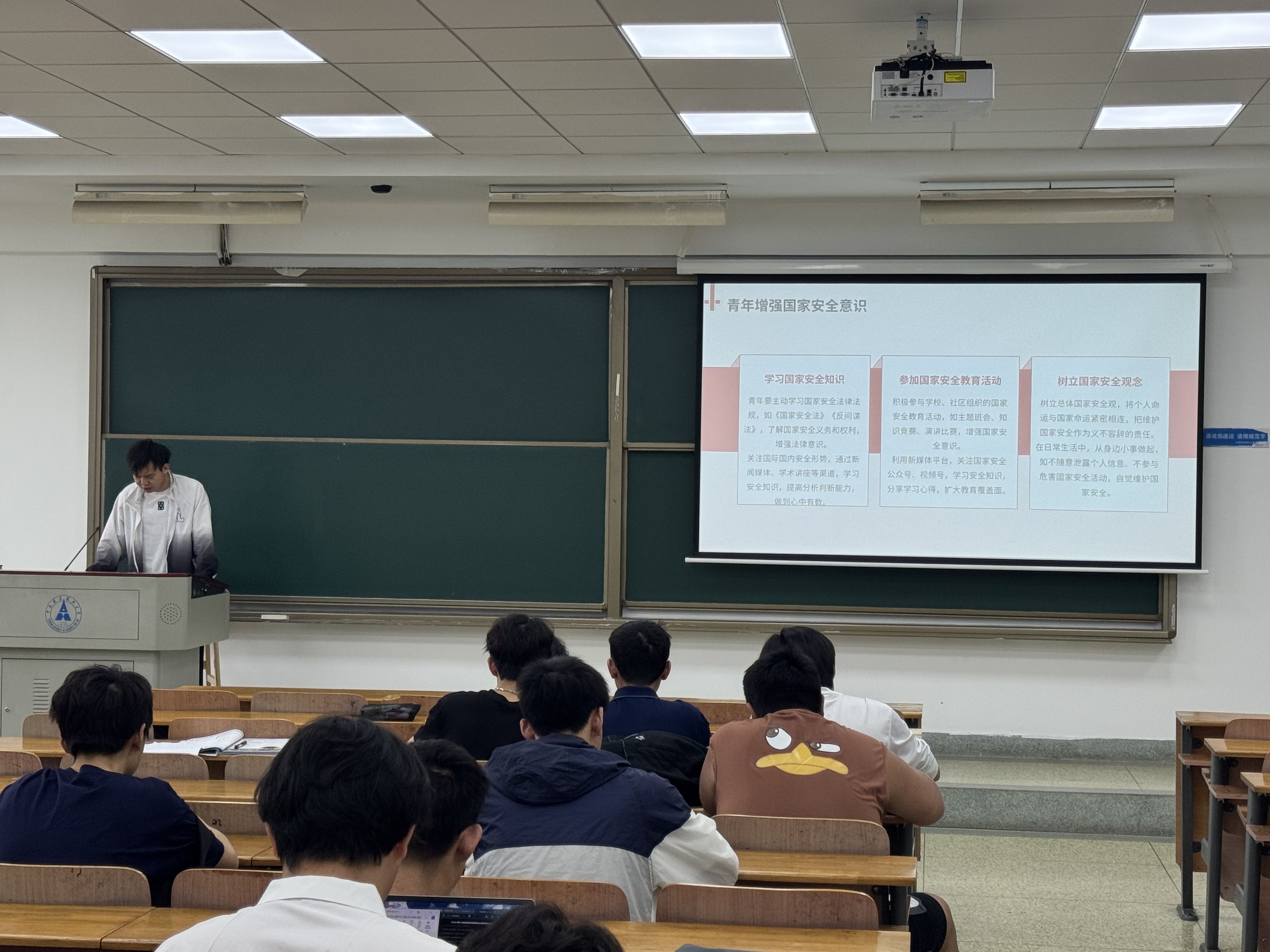在互动分享环节,多位同学踊跃发言。有的同学结合专业知识,提出在公安工作中维护国家安全的具体举措;有的同学从日常生活出发,倡议大家从身边小事做起,警惕危害国家安全的行为。最后,团支书对班会进行总结,呼吁全体同学将维护国家安全的责任内化于心、外化于行,在学习和生活中时刻保持警惕,为守护国家安全贡献青春力量。