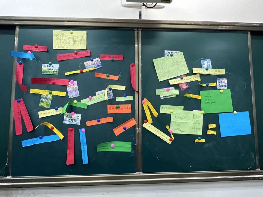 活动接近尾声,同学们以“我拥有”为开头造句,将生活中的小确信张贴于黑板中央。参与的过程中,同学们相互分享,惊喜地发现生活中存在着许多未曾留意的美好,在“我拥有”的幸福中更加热爱生活。