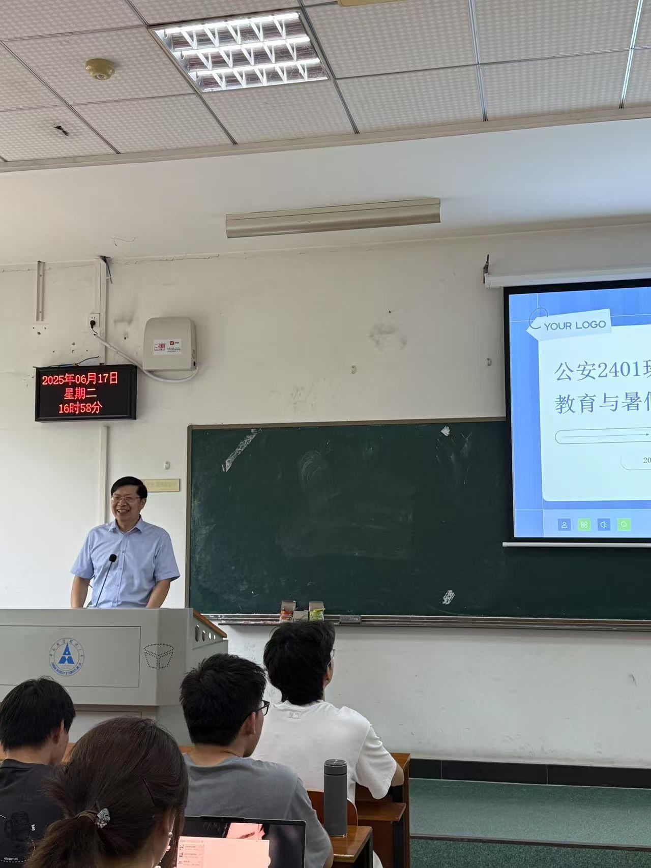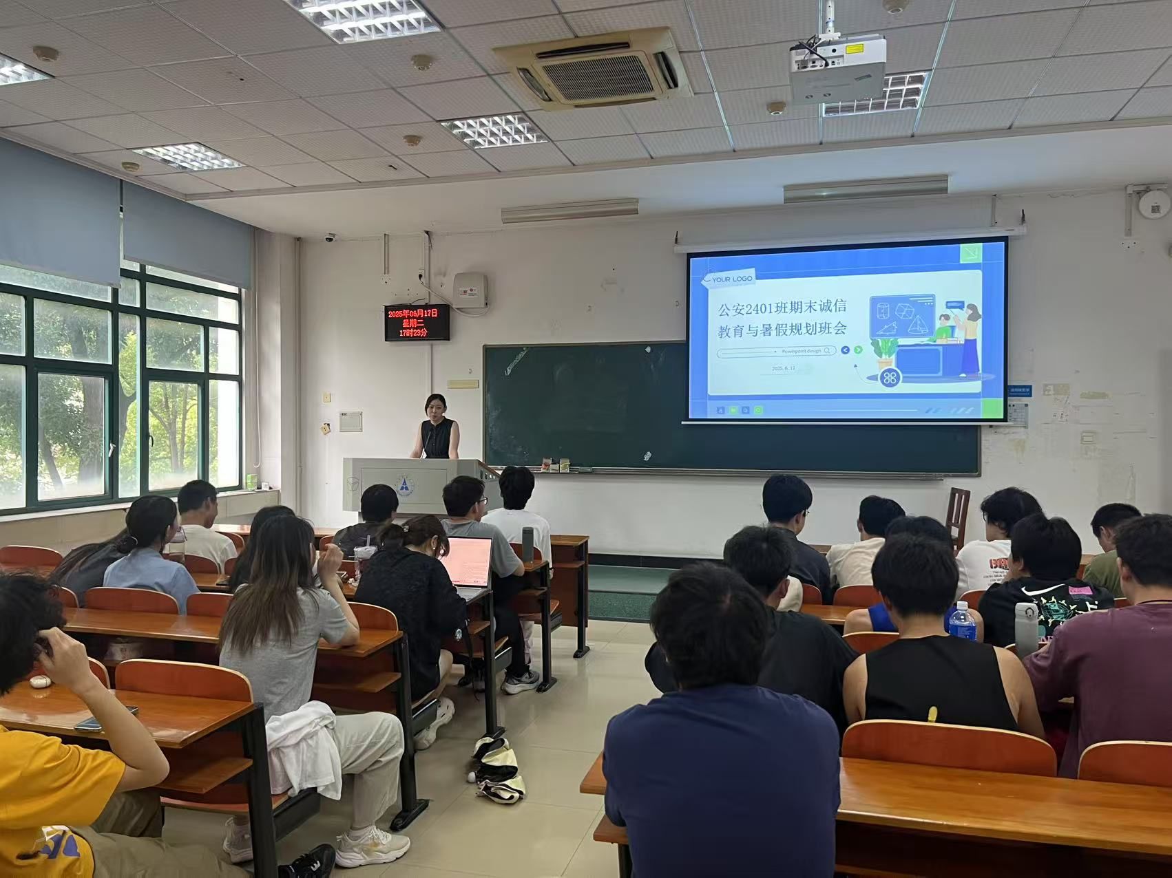 (通讯员 赵鑫)为引导学生树立诚信考试意识,科学规划暑期生活,公安2401班班导师董邦俊教授于6月17日在文波208教室组织召开“期末诚信教育与暑假规划”主题班会。