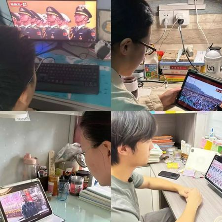 组织全院师生观看中国人民抗日战争暨世界反法西斯战争胜利80周年纪念大会及阅兵式。教职工齐聚文治楼二楼会议室集中观看,本科生与研究生分别组织同步学习观摩。