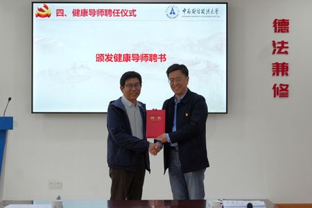 党委书记张志刚向校医院医生钱东彬同志颁发"健康导师聘书"。校医院党委书记刘晓燕表示,健康导师工作机制是校医院贯彻学校党委"以师生为中心"理念的重要举措,校医院将以此为契机定期开展健康讲座、急救技能培训等活动,助力师生身心健康发展。
