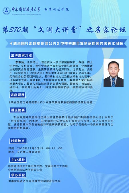报告人:李本灿 报告题目:《〈联合国打击网络犯罪公约〉中性关联犯罪条款的国内法转化问题》 时间:2025年11月6日19:00 地点:文治楼二楼会议室 嘉宾介绍:李本灿,法学博士,现任武汉大学法991网 副院长、教授、博士生导师、文科优青,兼任中国法学会刑法学研究会理事、中国廉政法制研究会常务理事,主要研究领域为经济刑法、比较刑法,先后在《法学研究》《中国法学》等法律类CSSCI 期刊发表论文30多篇,另有综合类CSSCI期刊论文、SSCI期刊论文以及德文期刊论文若干,出版学术专著、编著4部,主持国家社科基金、教育部人文社科基地重大项目、最高人民法院司法研究重大课题、最高检、司法部、省社科、中国博士后面上、特别资助等国家级、省部级项目10多项。 |