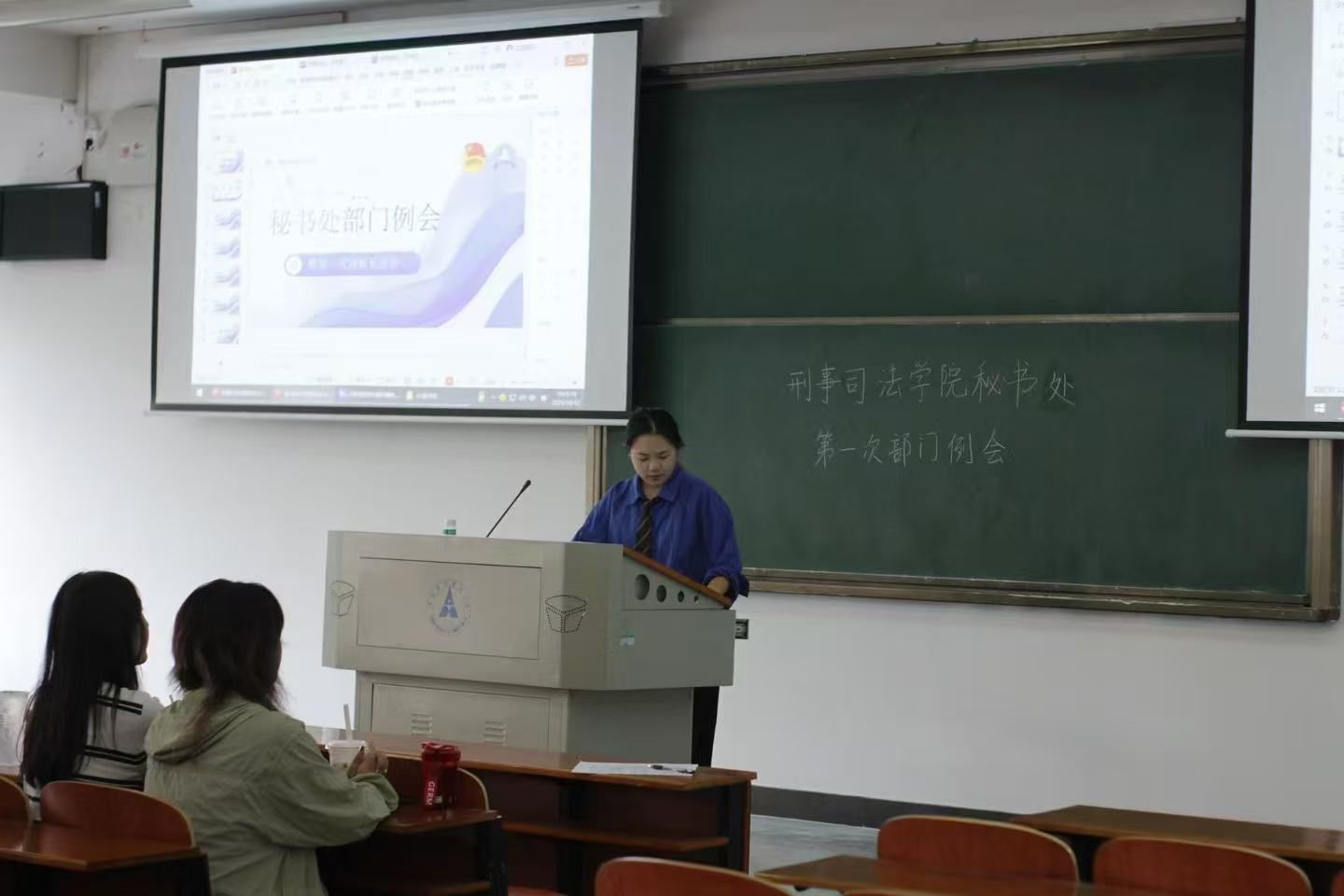 会议第二项,部门负责人及新干事依次进行自我介绍。负责人结合两年的工作经历,分享了从新人成长为骨干的历程,鼓励新成员勇于尝试、积极进取。在轻松活泼的氛围中,新成员依次上台介绍自己,他们来自不同专业与班级,却怀揣着同样的服务热情与责任担当。