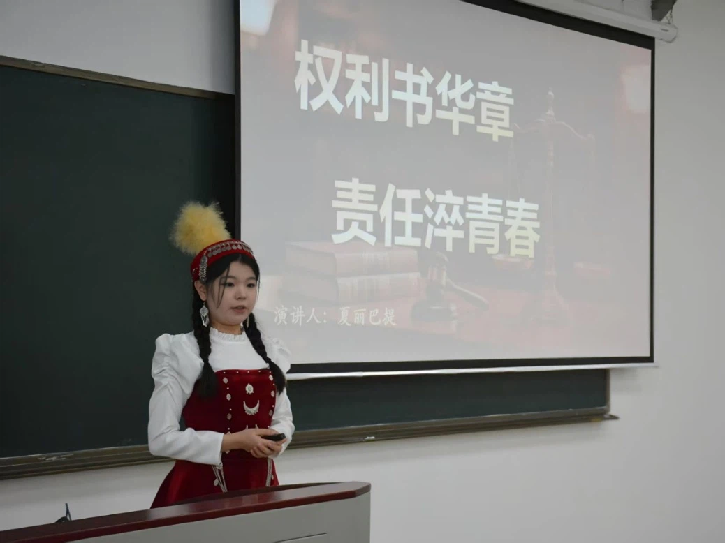 比赛现场气氛热烈,选手们慷慨陈词,妙语连珠;评委凝神聆听,公正评判。夏丽巴提·加力哈斯同学以家人经历为引,讲述了草原上朴素的权责统一观念,生动呈现了老一辈法律人的坚守与奉献,体现了法治精神在民族地区的深厚根基。段金瑞同学则聚焦人工智能发展,提出法律人应善用AI提升工作效率,同时坚守公平正义的初心,强调技术应为司法公正服务。每位选手的演讲都充满思辨光芒,展现了新时代法律学子的专业素养与责任担当。