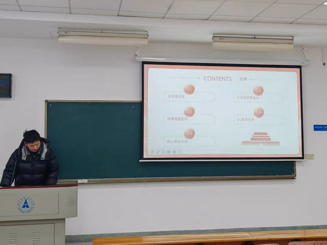 活动伊始,团支部书记王吴宇辰以当下正在举行的中华人民共和国第十五届运动会为切入点,向同学们介绍了全运会的由来和发展历程,再落脚于当下,阐释了第十五届全运会的时代意义和重要使命。