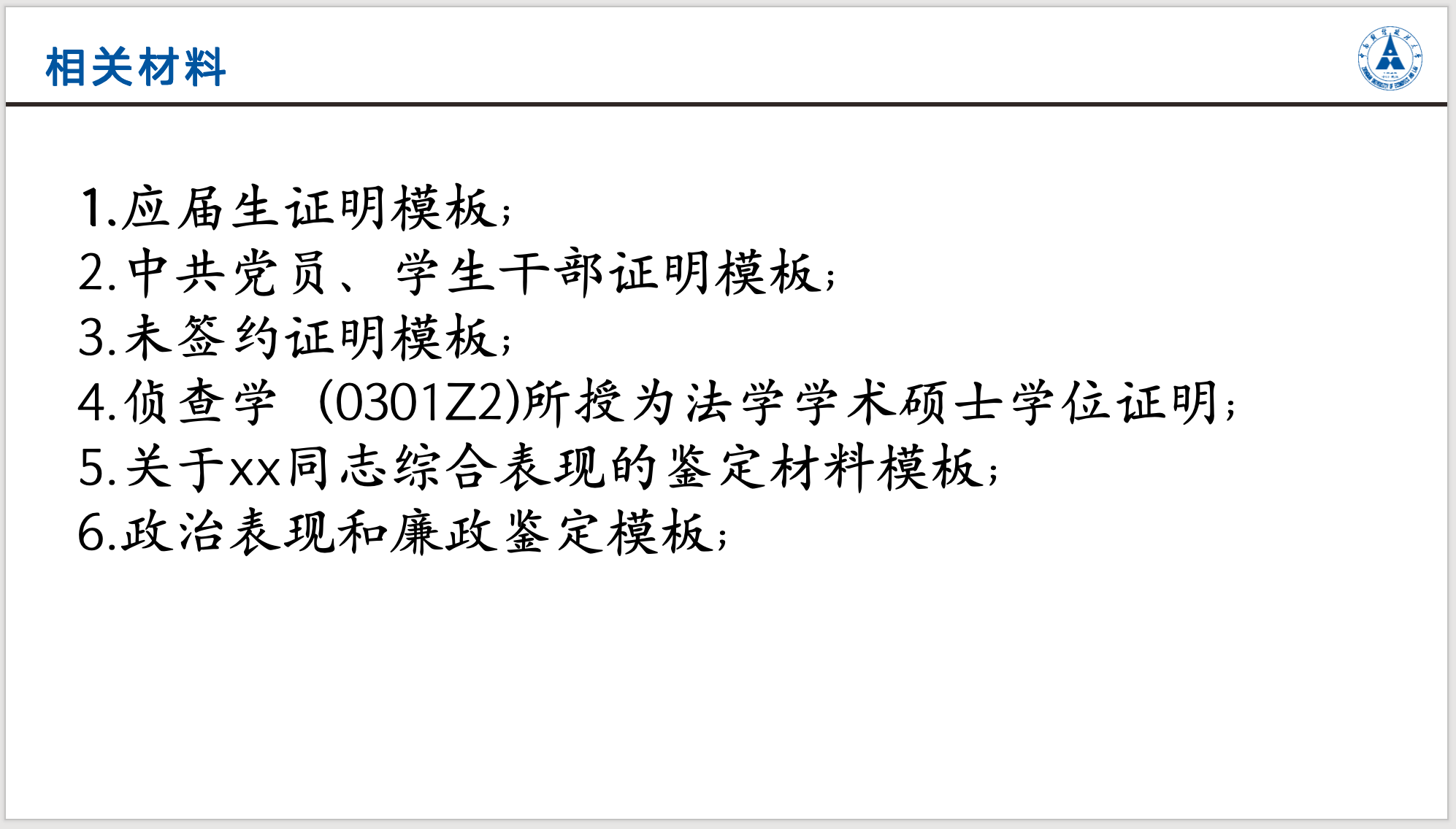 会议伊始,王晓丹围绕毕业生高频咨询的材料模板问题进行集中解答,分享应届生证明、中共党员及学生干部证明、未签约证明、侦查学学位授予证明和政审材料等各类标准化模板。同时,她着重强调模板填写的规范性要求,提醒同学们务必结合个人实际情况如实、准确填写。